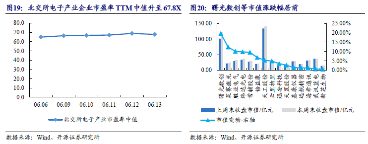 本周,从估值表现看,北交所电子产业44家企业的市盈率TTM中值升至67.8X。从本周个股市值表现来看,曙光数创+19.66%、莱赛激光+12.38%、胜业电气+10.12%分列市值涨跌幅前三甲。(电子公司类别:包含消费电子、医疗电子、新能源电子设备、仪器仪表等细分行业)
