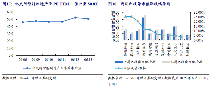 本周,从估值表现看,北交所智能制造产业53家企业的市盈率TTM中值升至50.8X。从本周个股市值表现来看,西磁科技+25.80%、花溪科技+25.52%、七丰精工+20.77%分列市值涨跌幅前三甲。(智能制造公司类别:包含机械设备、机械零件制造、军工制造、交运设备、电气设备等细分行业)