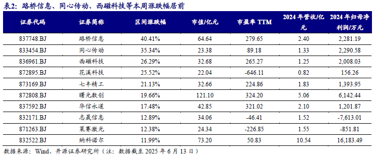 本周(2025年6月9日至2025年6月13日),前十大涨跌幅标的分别是路桥信息、同心传动、西磁科技、花溪科技、七丰精工、曙光数创、华信永道、志晟信息、莱赛激光、纳科诺尔。