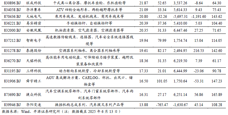 2025年5月31日,中国汽车工业协会发布《关于维护公平竞争秩序,促进行业健康发展的倡议》。此后, 17家车企承诺“支付账期不超过60天”。现阶段北交所内汽车产业链共有24家,截至2025年6月13日总市值达到635.17亿元。从2024年的应收账款天数来看,最低的为天铭科技(61.17天),最长的为同心传动(199.47天),相较于此次车企承诺的60天期限仍然偏长。林泰新材(920106.BJ)为国内乘用车批量配套提供湿式纸基摩擦片,与国内头部自主品牌自动变速器生产商合作紧密,其中比亚迪自2024年2月起向公司批量采购自动变速器摩擦片产品。开特股份(832978.BJ)是一家专业从事汽车的传感器、功率模块/电阻、执行器、控制器等汽车零部件产品的研发、生产、销售的高科技企业。根据公司公告,比亚迪为开特股份第一大客户。