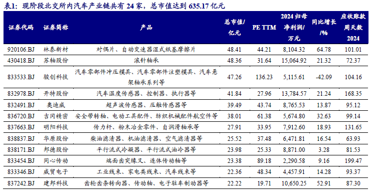 现阶段北交所内汽车产业链共有24家,截至2025年6月13日总市值达到635.17亿元。从2024年的应收账款天数来看,最低的为天铭科技(61.17天),最长的为同心传动(199.47天),相较于此次车企承诺的60天期限仍然偏长。