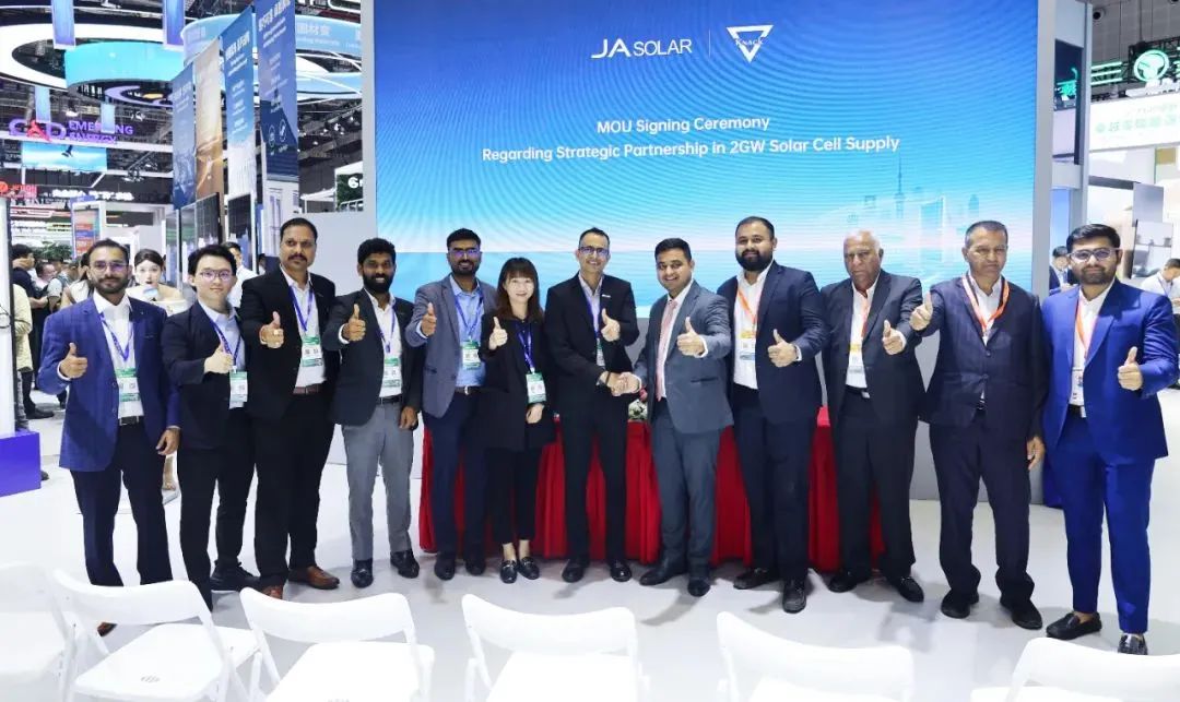 6月11日,展会现场,晶澳科技与KNACK ENERGY共同签署2GW电池供货MOU协议,此次合作不仅体现了双方在全球能源转型中的坚定承诺,还将推动印度本土光伏制造能力的发展。