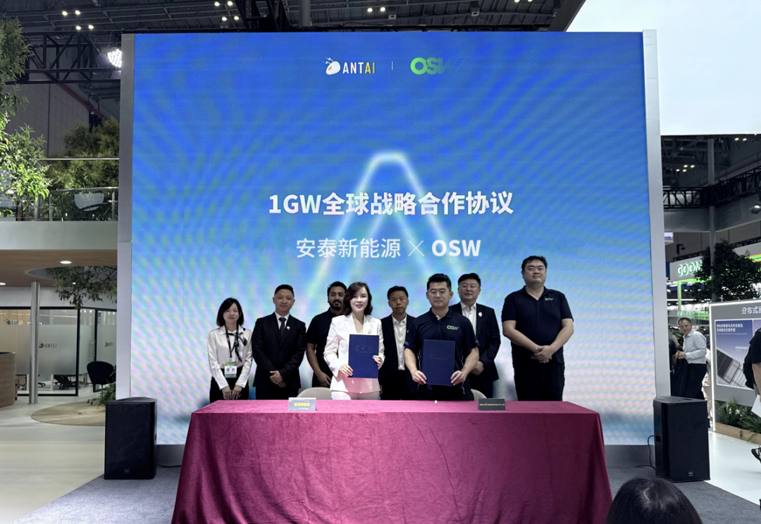 6月11-12日,安泰新能源在第十八届SNEC展会现场,与RAYSTECH GROUP PTY LTD正式签署 500MW 分销协议;与山东省工业设备安装集团有限公司签订战略合作协议签约;与SPV达成100MW年度框架协议签约;与 Clean Kinetics 进行300MW项目签约, 与OSW签订1GW全球战略合作协议。