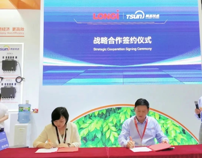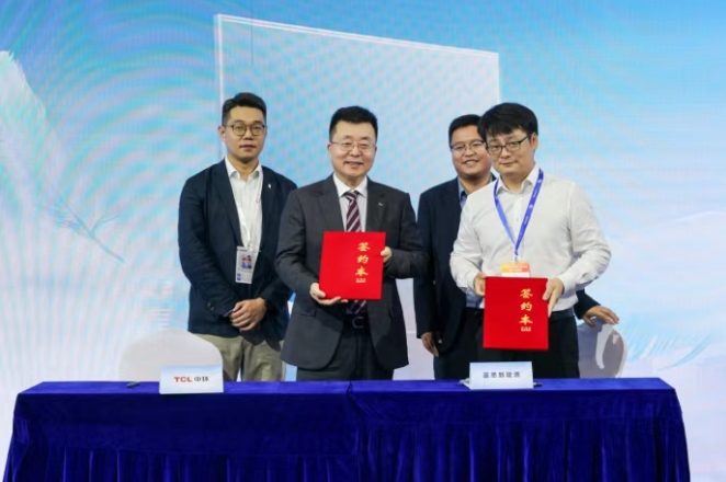 展会期间,TCL中环与蓝思科技旗下蓝思新能源正式签署战略合作协议。双方宣布将围绕光伏材料创新、场景化解决方案与全球化布局展开深度协同,并联合发布突破性轻质光伏组件,为全球能源转型注入强劲动能。