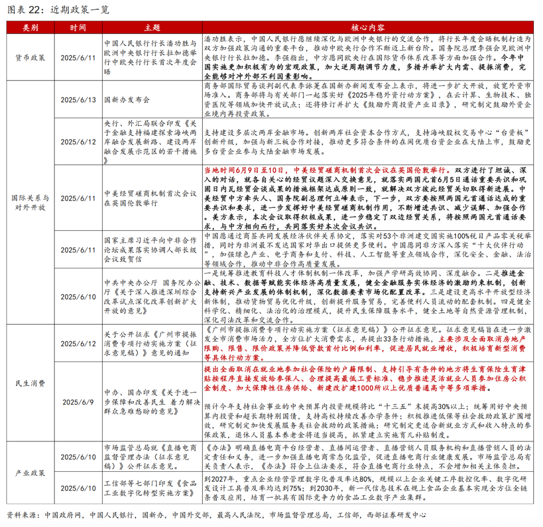 消费政策:6月9日,中办、国办印发《关于进一步保障和改善民生 着力解决群众急难愁盼的意见》,从增强社会保障公平性、提高基本公共服务均衡性、扩大基础民生服务普惠性、提升多样化社会服务可及性等方面作出部署。6月12日,《广州市提振消费专项行动实施方案(征求意见稿)》公开征求意见,提出取消房地产限购、限售、限价政策并降低贷款首付比例和利率,促进居民就业增收,积极培育新型消费等具体行动方案。