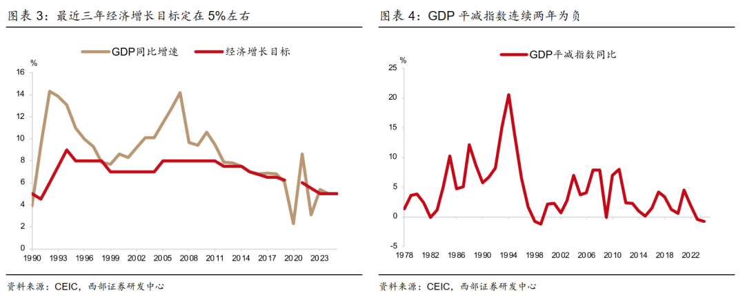 如果宏观政策积极应对,“十五五”期间仍然有可能维持5%左右的中高速增长。2023年和2024年GDP分别增长5.2%和5%(图表3)。2025年1季度GDP同比增长5.4%,2季度以来受外部冲击和房地产市场下滑影响经济增速有所放缓,但是货币政策进一步宽松,下半年财政政策力度也有可能加大,我们预计2025年仍然有可能实现5%左右的增长。过去两年GDP平减指数持续下跌(图表4),反映当前经济活动仍然低于潜在产出水平。当前国内经济面临价格下跌风险,需要进一步加大宏观政策逆周期调节力度,提振经济增长和通胀。我们预计,如果国内宏观政策积极应对,促进物价温和回升,让经济回归潜在产出水平,“十五五”期间仍然有可能实现5%左右的经济增长。