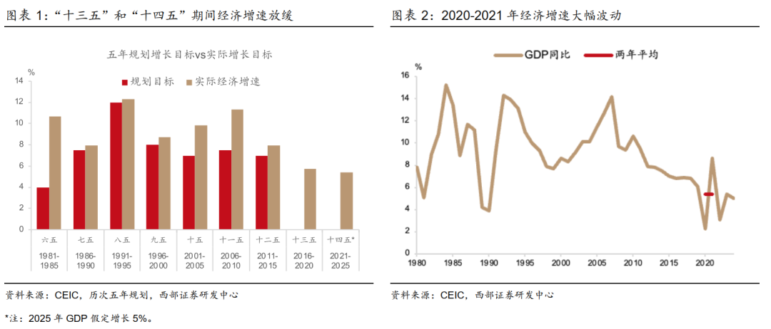 中国将于2026年开始实施“十五五”规划。2025年是“十四五”规划收官之年,距离2035年远景目标还有十年时间。“十三五”和“十四五”没有给出规划期间经济增长率的具体目标。“十三五”期间,我国年均GDP增速5.8%,“十四五”期间,预计我国年均GDP增速预计5.4%左右。“十三五”和“十四五”期间,经济增长从高速增长向中高速增长转变。
