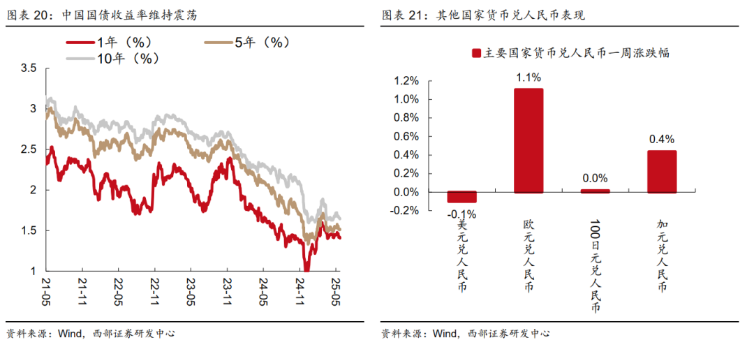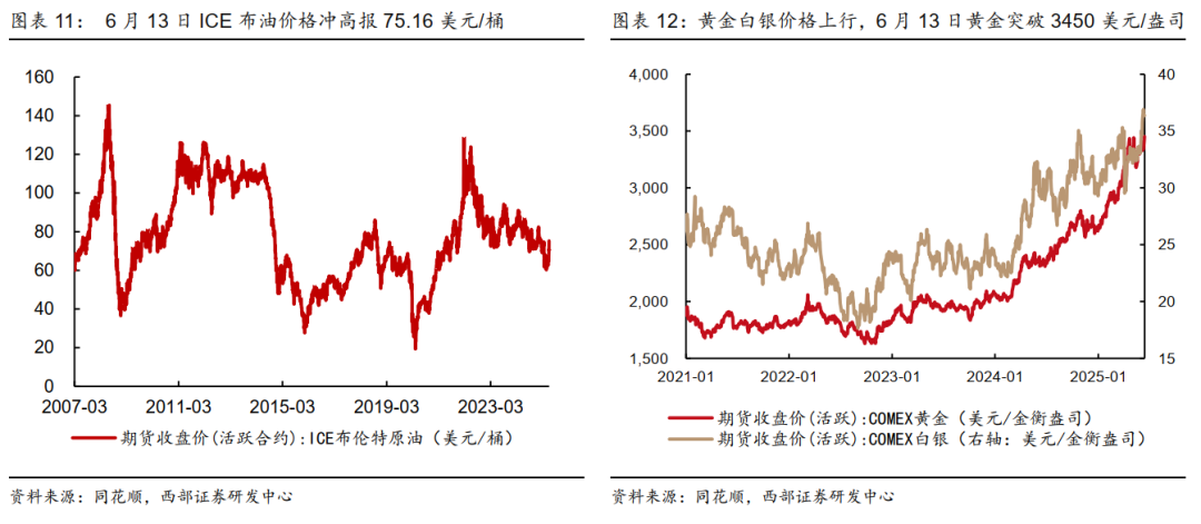 截至6月13日,A股和港股涨跌分化,美股走弱。受到中东军事冲突直接触发了短期的全球避险情绪,导致本周风险资产普遍疲软,而金价拐头上行。另外,冲突直接带动油价攀升,对欧美已经降温的通胀数据形成新的上行风险,2年期和10年期美债收益率上行。相较之下,国内宏观基本面维持平稳。从汇率的角度来看,美元兑人民币仍然维持双向震荡,欧元和加元则兑人民币表现更强势。