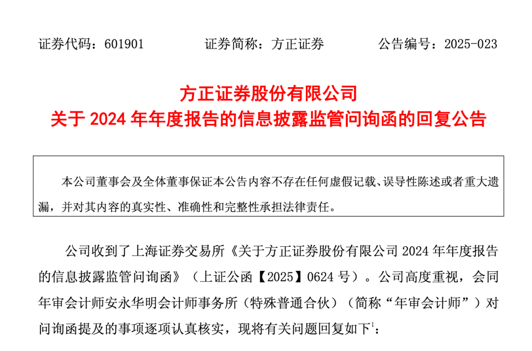 金融虎讯 6月16日消息,近日,方正证券股份有限公司发布了一则引人关注的公告——关于2024年年度报告的信息披露监管问询函的回复公告。此前,该公司收到上海证券交易所《关于方正证券股份有限公司2024年年度报告的信息披露监管问询函》(上证公函【2025】0624号),此次回复公告便是公司会同年审会计师安永华明会计师事务所(特殊普通合伙)对问询事项的详细回应。