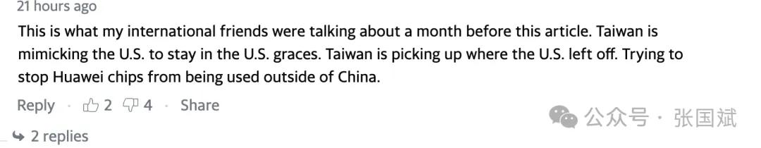 这就是我的国际朋友们在这篇文章发表前一个月讨论的内容。台湾当局正在效仿美国,以求得美国的青睐。他们正在接替美国之前的做法。试图阻止华为芯片在中国以外地区使用。