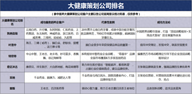 二是“市场实战之智”。丰富的实战经验不仅能帮助企业找准战略方向,还能有效避免企业陷入战略误区。深耕医药大健康领域20余年的凯纳咨询,积累了丰富的实战经验,已为云南白药、片仔癀、东阿阿胶、上药集团等超过50家知名药企提供全案服务,并不断拓展业务领域,在功能日化、功能美妆、健康快消、母婴等行业,为三得利、娃哈哈、九阳等众多知名企业提供服务。其他上榜的策划公司同样表现出色,如叶茂中曾服务舒肤佳、法兰琳卡、海王等品牌,采纳也曾助力千金药业、顾康力、减肥达人等品牌的打造。