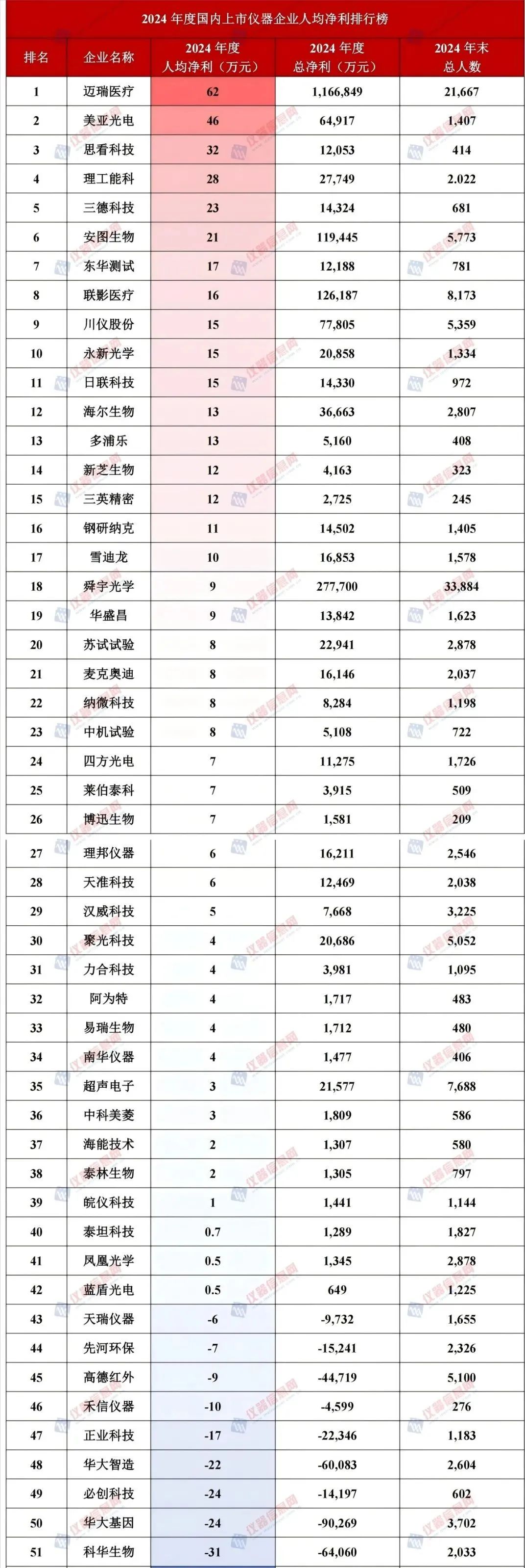 在仪器行业竞争日益激烈的当下,整体的营收与利润虽为衡量企业经营效率的关键指标,但人均营收和人均利润更能精准映射企业当下的经营状态,从侧面展现其管理水平、生产效能、技术实力等核心竞争力要素。