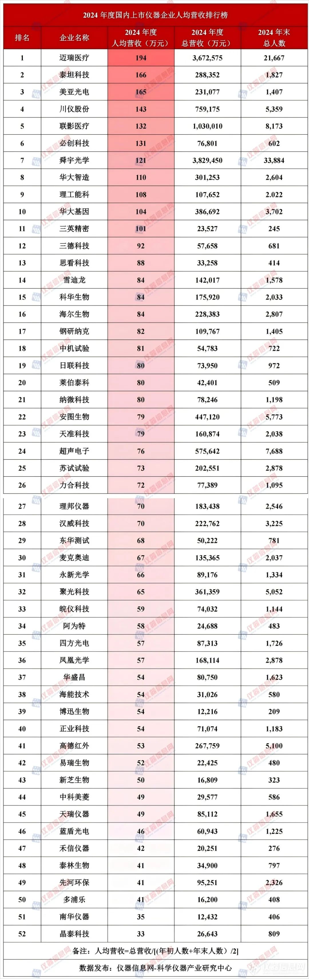 导读:本文依据52家国内上市仪器公司披露的员工数量、营业收入、净利润等详实数据,精心编制2024年度国内上市仪器公司人均营收和人均净利榜单,为行业发展提供深度洞察与参考。