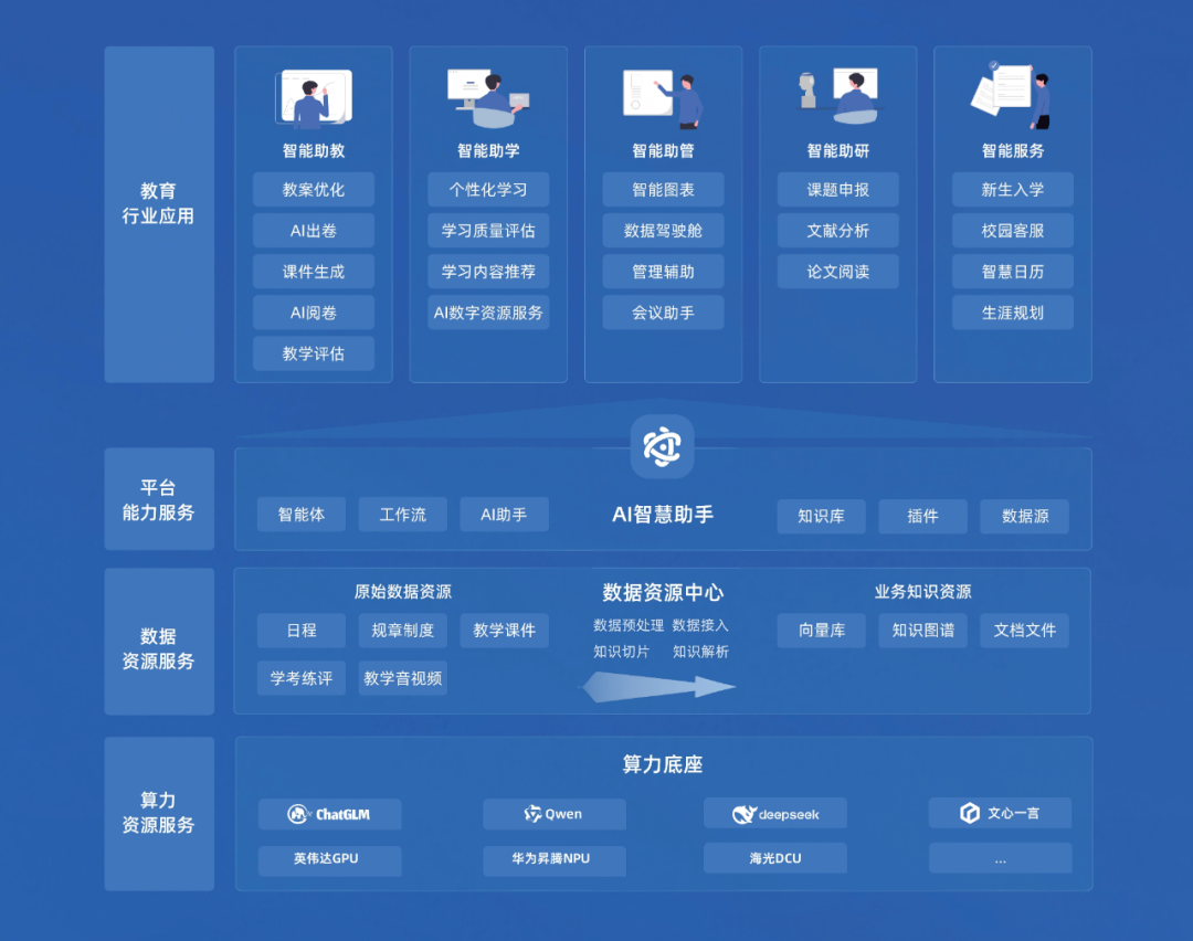 该方案以高校AI智慧助手为承载,构建教育智能化体系,形成“五大应用方向+三大服务支撑”的双层架构。在行业应用层,通过“智能助教、智能助学、智能助管、智能助研、智能服务”五大方向,构建AI 个性化学习、AI教学评估、AI数据驾驶舱、AI文献分析、AI校园客服等相关场景,覆盖教学、科研、生活等全流程智能服务。