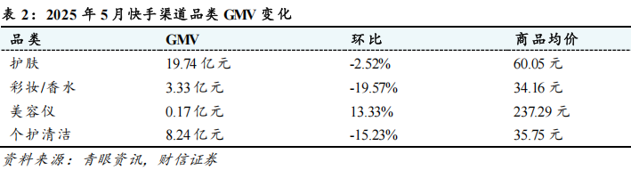 品类端,彩妆香水品类增长动能更为强劲。据青眼资讯统计,2025年5月,护肤/个护品类,天猫、抖音、快手月度GMV分别为191亿元、161.07亿元、19.74亿元,同比对应变动+33.6%、+13.5%、-27.5%;彩妆/香水品类,天猫、抖音、快手渠道月度GMV分别为64.73亿元、64.27亿元、3.33亿元,同比对应变动+74.1%、+22.9%、-27%。值得注意的是,彩妆香水品类在天猫、抖音平台均呈现更快的增速,尤其是在天猫平台实现了超70%的同比增长,我们猜测可能是受“520”节日消费场景对彩妆产品的拉动效应影响。