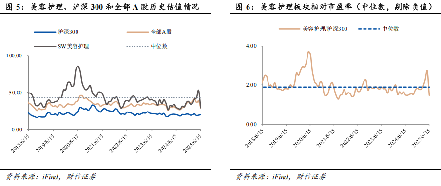 截至2025年6月15日,申万美容护理板块市盈率(TTM,整体法,剔除负值,下同)为29.36倍,位于2016年以来的历史后3.64%分位。沪深300市盈率为19.98倍,其中,申万美容护理相较沪深300溢价0.47倍。