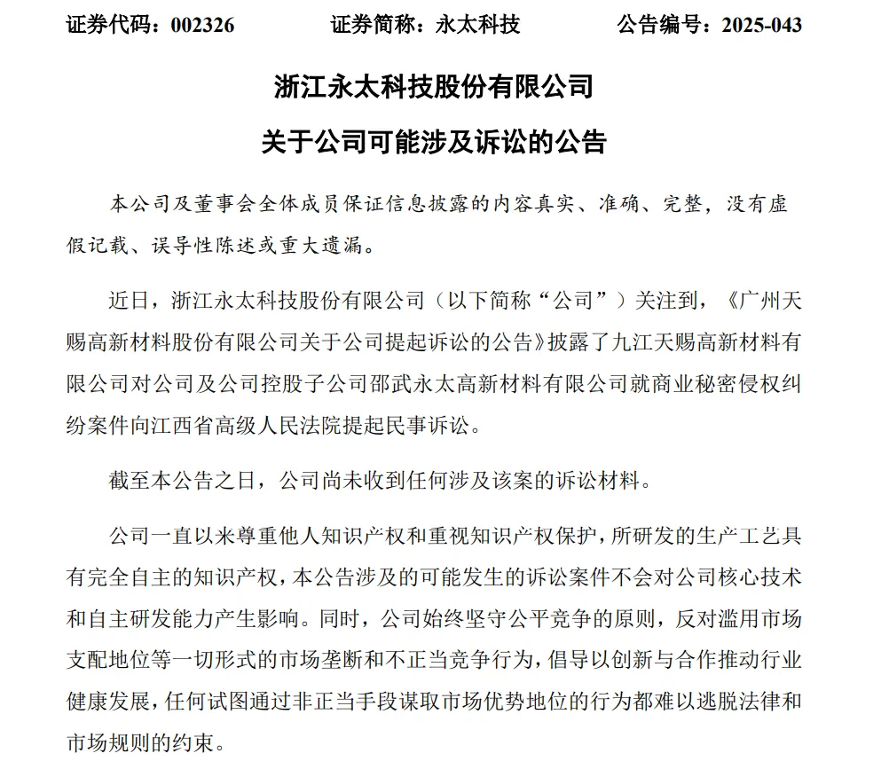 7月2日晚间,永太科技披露《关于公司可能涉及诉讼的公告》称,截至公告之日,公司尚未收到任何涉及该案的诉讼材料。