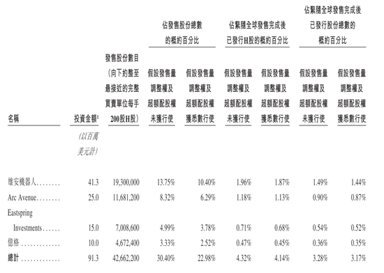 极智嘉基石投资者分别为雄安机器人、Arc Avenue、保诚旗下国际顶级长线投资机构Eastspring Investments、亿格,一共认购9130万美元。其中,雄安机器人认购4130万美元、Arc Avenue认购2500万美元,Eastspring Investments认购1500万美元,亿格认购1000万美元。