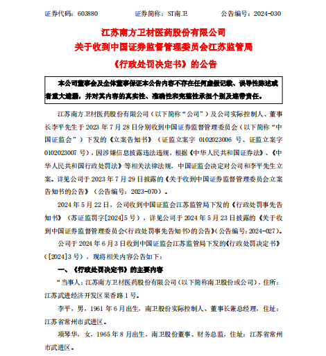 6月3日,ST南卫(维权)发布公告,披露了公司及其实际控制人、董事长兼总经理李平先生,收到江苏证监局行政处罚的具体内容。