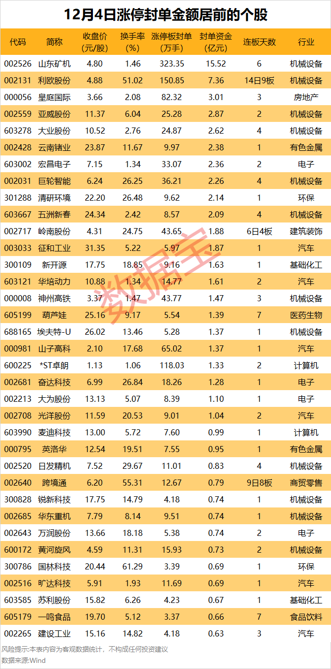 以封单金额计算,10股封单金额超2亿元,山东矿机、利欧股份、皇庭国际封单金额居前,分别为15.52亿元、7.36亿元和3.01亿元。
