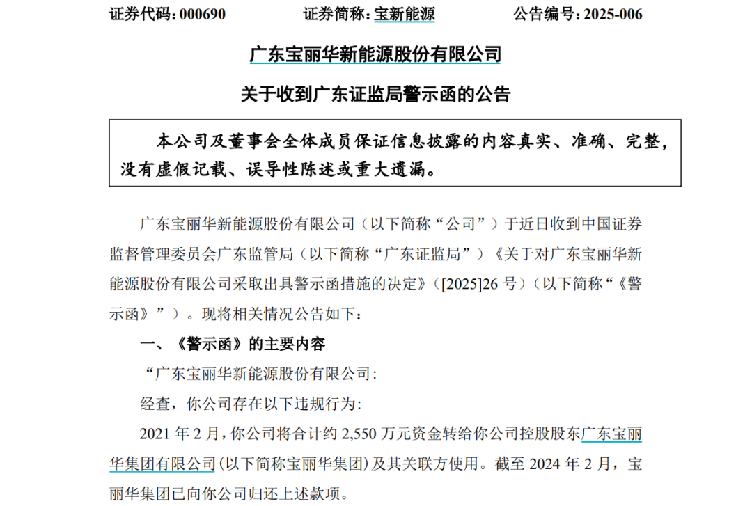 广东证监局表示,宝新能源的上述关联方非经营性资金往来未按规定履行相应的审议程序和信息披露义务。根据相关规定,决定对宝新能源采取出具警示函的行政监管措施。