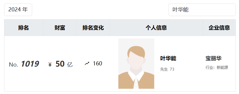 值得一提的是,2024年10月,叶华能以50亿元人民币的财富位列《2024年·胡润百富榜》第1019位。