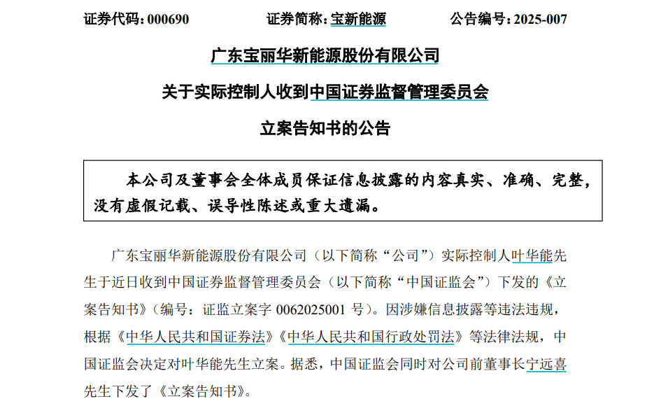 3月14日晚间,宝新能源发布公告称,因涉嫌信息披露等违法违规行为,公司实际控制人叶华能被中国证监会立案。