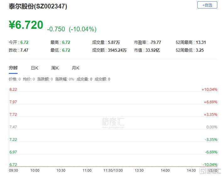 泰尔股份跌停,报6.72元,总市值为33.92亿元。