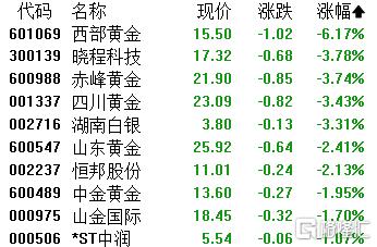 贵金属板块跌幅居前,西部黄金跌超6%,晓程科技、赤峰黄金、四川黄金、湖南白银、山东黄金等跟跌。