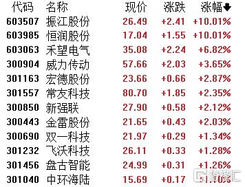 风电设备板块走强,振江股份、恒润股份涨停,禾望电气、威力传动、宏德股份、常友科技、新强联、金雷股份等跟涨。