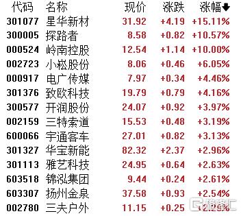 露营经济板块涨幅居前,星华新材涨超15%,探路者、岭南控股、电广传媒、致欧科技、开润股份、三特索道(维权)等跟涨。