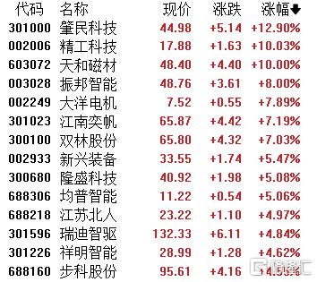 人形机器人板块走强,肇民科技涨近13%,精工科技、天和磁材、振邦智能、大洋电机、江南奕帆、双林股份等跟涨。