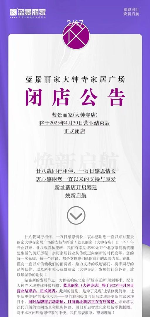 2025年2月22日,位于北京北三环的蓝景丽家大钟寺家居广场(简称“蓝景丽家大钟寺店”)发布闭店公告称,大钟寺店将于2025年4月30日营业结束后,正式闭店。