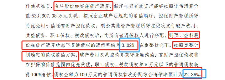 以债权金额为100万元的普通债权为例,金科股份这边首次分配综合清偿率预计能达到22.36%,重庆金科的该类债权首次分配综合清偿率预计为11.64% 。