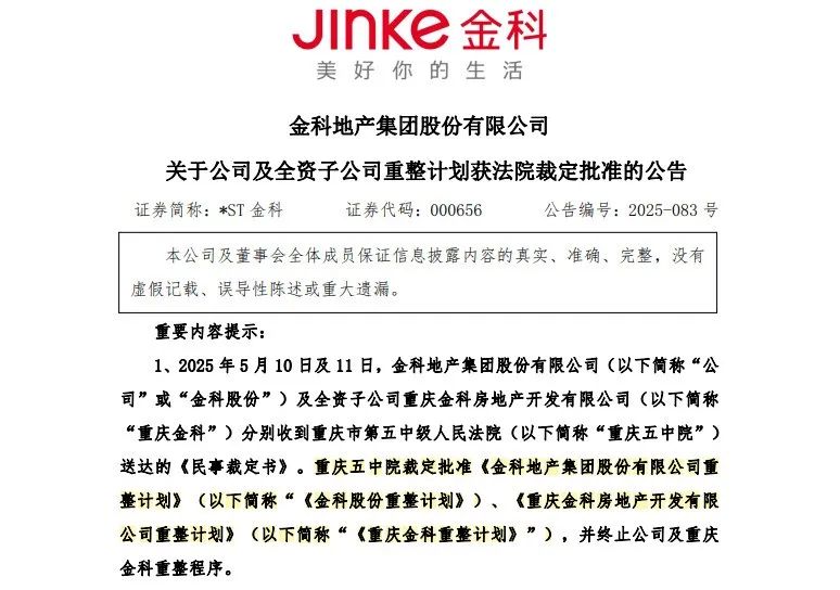 朋友们,地产行业的历史时刻来了,2025年5月11日晚间,*ST金科公告:公司重整计划获批了!