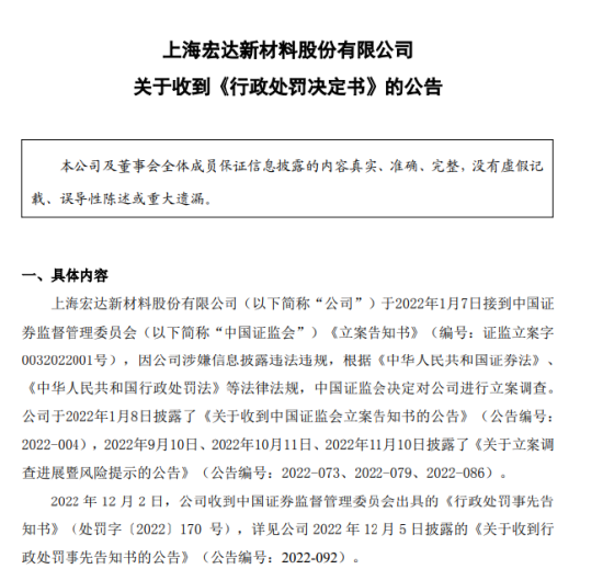 公告显示,ST宏达未按规定披露实际控制人,连续两年年报虚增收入和利润超8亿元、年度报告虚假记载,公司及相关高管被证监会处以逾1500万元罚款。