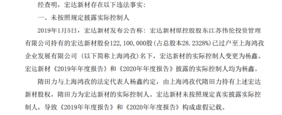 公告显示,2019年1月5日,ST宏达发布公告称,公司实际控制人变更为杨鑫。事实上,隋田力与上海鸿孜的法定代表人杨鑫约定,由上海鸿孜代隋田力持有上述ST宏达股权,隋田力为ST宏达的实际控制人。ST宏达未按照规定真实披露实际控制人,导致《2019年年度报告》和《2020年年度报告》构成虚假记载。