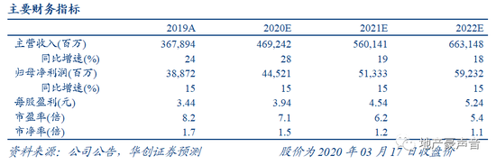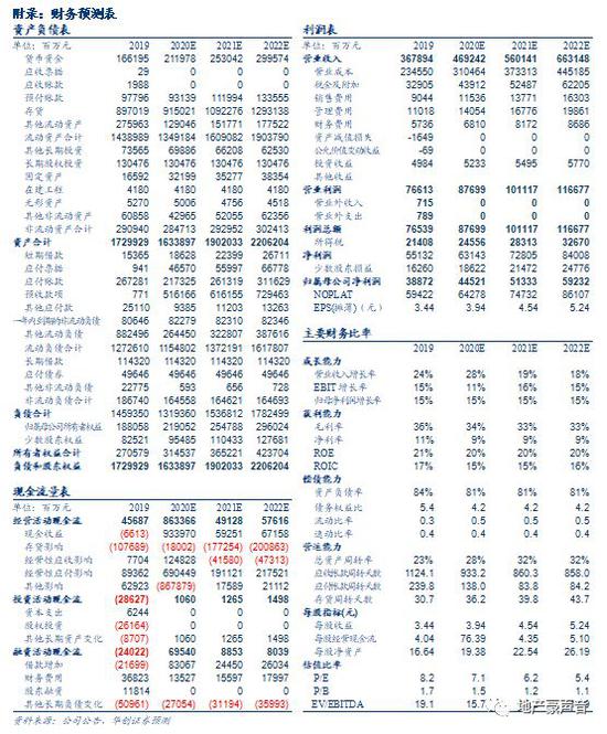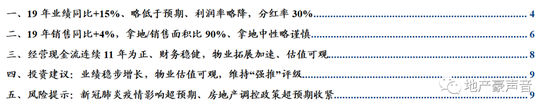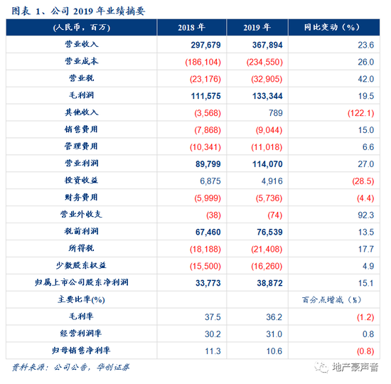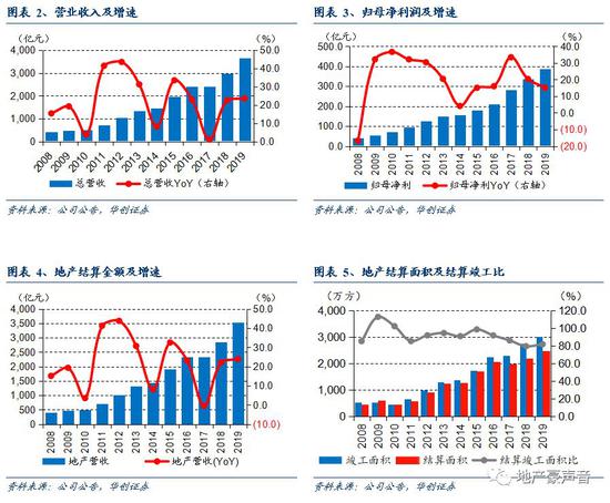 2019年公司营业收入3,678.9亿元,同比+23.6%;归母净利润388.7亿元,同比+15.1%;每股基本收益3.47元,同比+13.3%;净资产收益率为20.7%,同比-1.0pct;地产结算收入2,340.4亿元,同比+21.8%;毛利率和归母净利率为36.2%和10.6%,同比分别-1.2pct和-0.8pct;三费费率为7.0%,同比-1.1pct;投资收益49.8亿元,同比-26.6%。我们认为,公司业绩略低于预期源于:存货计提减值11.4亿元,影响归母净利润7.8亿元;投资性房地产计提减值5.1亿元;长期股权投资计提减值21.5亿元;估算多计提折旧摊销27.0亿元;多计提土增税准备金清算148.0亿元,预计上述科目影响业绩部分或将在后续业绩期冲回。此外,每10股派息10.45元,分红率30%,股息率为3.7%。