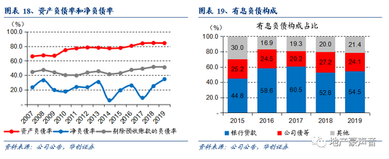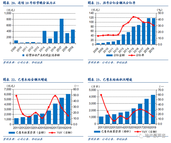 19年末公司资产负债率84.6%,同比+0.6pct;净负债率仅34.7%,同比+9.7pct,处于行业低位;公司19年至今发债多项利率处于行业低位,3月发行10亿/3.42%/7年公司债。公司经营情况稳定,在龙头房企中是仅有的连续11年经营现金流为正的公司,18年经营性活动现金流净额457亿元。19年末公司已售未结金额6,091.0亿元,同比+14.8%,覆盖19年地产结算金额1.73倍,锁定未来业绩释放。