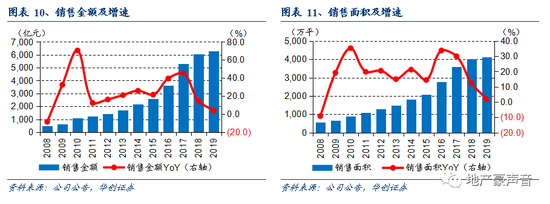 2019年公司实现销售金额6,308.4亿元,同比+3.9%;销售面积4,112.2万平,同比+1.8%。公司所销售的产品中,住宅占86.4%,商办占10.0%,其它配套占3.6%;144平方米以下的中小户型占比91.2%。2019年公司在全国商品房市场的份额约4%,在21个城市的销售金额位列当地第一,在12个城市排名第二。