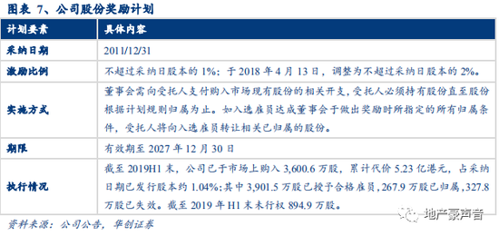 公司于2011年12月30日采纳股份奖励计划,8年内有效,占比不超过采纳日总股本的1%,2018年4月13日调整为不超过2%,即6,932万股;2019年3月26日有效期延长至2027年12月30日。截至2019H1末,公司已于市场上购入3,601万股,累计代价5.23亿港元,占采纳日期已发行股本约1.04%;其中3,901.5万股已授予合格雇员*,267.9万股已归属,327.8万股已失效,未行权894.9万股。