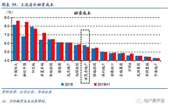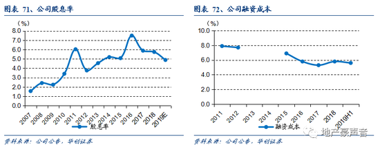 发债方面,公司2018年境内3年债成本在5.00-6.43%,2019年至今降至4.12-4.65%;2019年中10年期美元债成本降至5.60%,处于民营房企低位。
