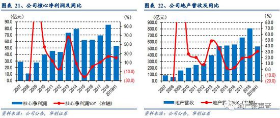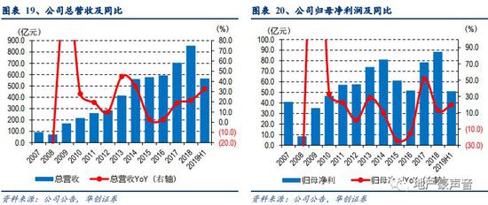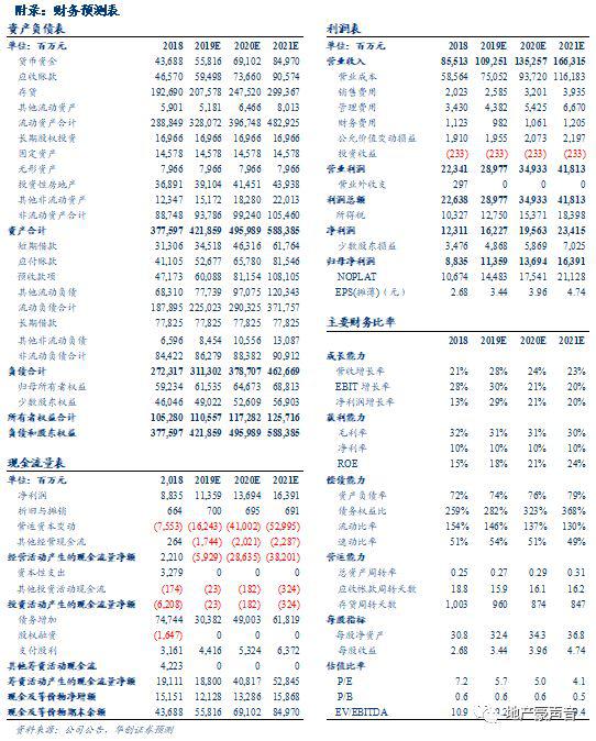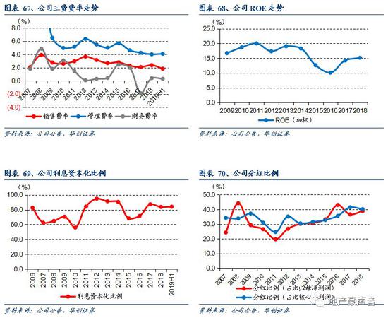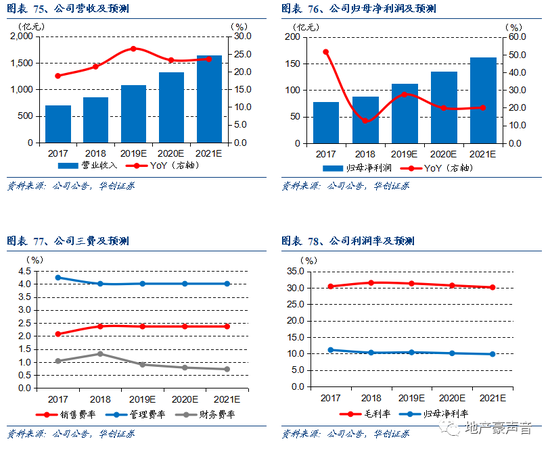 2)销售均价稳增&拿地均价稳定保证未来结算毛利率稳定:由于2016-2017年获取部分一线城市大体量地块、2018-2019H1平均拿地均价占比销售均价35%,而2017年以来销售均价平均每年增长9%,因此较强的产品力赋予了公司在行业涨幅有限的背景下,能够实现销售均价的上涨。另一方面,2018-2019H1公司拿地成本管控更趋谨慎,并通过收并购方式获得低价土地,这也将保障结算毛利率稳定。我们根据分业务毛利率综合得到2019-2021年公司毛利率稳中略降,预计分别为31.8%、31.2%和30.5%。