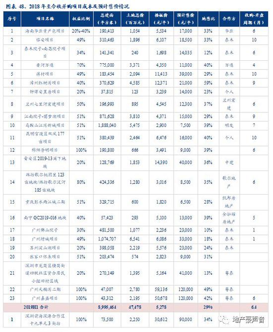 在2019年行业集中度提升、资金仍较紧的大背景下,公司显著加快了收并购步伐。2019H1公司收并购拿地面积占比64%,其中包括大量从泰禾集团、粤泰股份、明发集团等系列闽系房企手中收购的项目。我们对公司2018-2019H1的收并购项目进行梳理,可以看到公司收并购项目总成本占比收购货值分别为34%和29%,总体成本控制合理,并且其中不乏广州天鹅湾这样的优质项目;并且2019H1收并购项目大部分已开盘,平均收购-开盘周期6.4个月,考虑到项目基本处于一二线城市,整体项目周转较快。