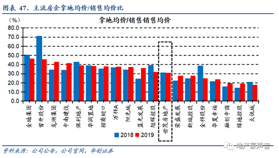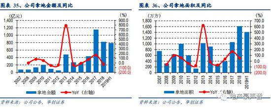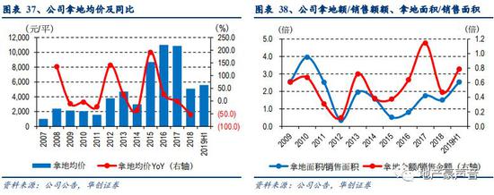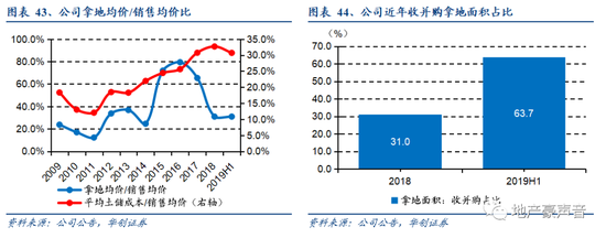 横向对比来看,公司在2019H1拿地力度处于主流房企第一,其中拿地金额/销售金额比达到79%,拿地面积/销售面积比达到254%;拿地成本控制处于中等水平*,拿地均价/销售均价比为31%。