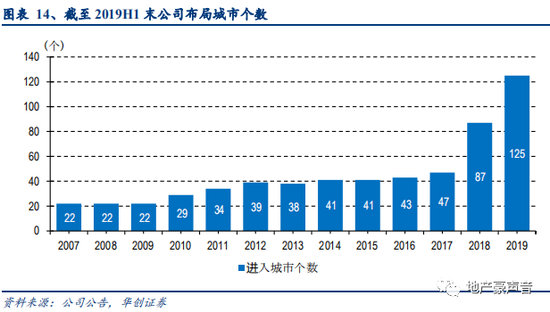 公司在2018-2019年大幅扩张,分别新进40城和38城;2019年末布局全国125城。以2018年末布局的87城来看,其中21城位于福建省,能级下沉至县,在如福建南安等县城的市占率位于第一。2017-2019年公司销售额CAGR高达61%,销售面积CAGR高达55%。