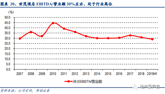 目前世茂酒店在全国拥有及筹开国际知名品牌酒店27家,运营及筹开中的自主品牌酒店91家,酒店客房总数逾25,170间,年接待客流超520万,EBITDA率30.8%,处于行业龙头地位。2019H1公司酒店营收10.0亿元,同比+13.2%;2018年营收19.1亿元,其中上海世茂皇家艾美酒店和上海外滩茂悦大酒店分别占比16%和21%;2014-2018年酒店营收CAGR12.8%。