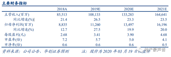 综上预测,我们预计公司2019-2021年归母净利润分别为113、135和162亿元,同比增速分别为28%、20%和20%,对应EPS为3.41、3.90和4.68元。
