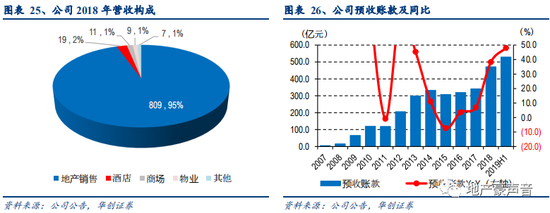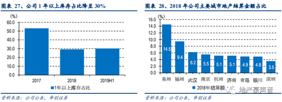 总体来看公司自2017年业绩低谷稳步回升,2016-2018年营收、归母净利润和核心净利润CAGR分别为31%和17%。2018年实现营收855亿元,同比+21.4%;归母净利润88.3亿元,同比+12.7%;核心净利润85.5亿元,同比+23.4%。2019H1实现营收566亿元,同比+32.9%;归母净利润51.1亿元,同比+19.5%;核心净利润53.1亿元,同比+20.6%。2019H1末公司在手预收款529亿元,同比+48.0%,预收款横向对比不高的原因主要在于结算进度较早以及去库存导致现房销售比例略高。但是考虑到公司目前1年以上库存已经降至30%,土储结构调整基本完毕,后续预收账款将持续累计。
