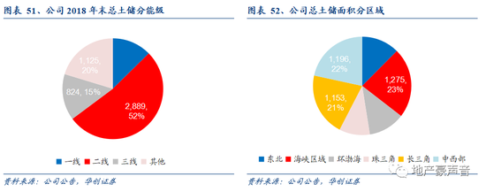 截至2018年末,公司总土储面积5,538万方,其中一二线分别占比13%和52%,三线占比15%;低能级城市主要分布于海峡区域,如福清、晋江、南平、沙县等。分区域来看,海峡区域、中西部和长三角分别占比23%、22%和21%,东北、环渤海和珠三角分别占比12%、12%和10%。